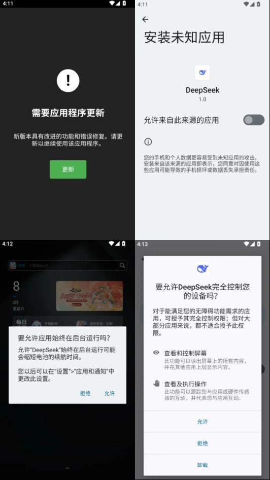 △ 诱导用户“更新”(左上)、诱导用户安装“带毒”子安装包(右上)、诱导用户授权其后台运行(左下)、诱导用户授权其使用无障碍功能(右下)。